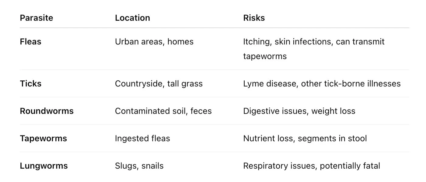 Different environments bring different risks—urban dogs face more flea exposure from other pets and shared spaces, while countryside dogs are more likely to encounter ticks and lungworm from wildlife and natural habitats.